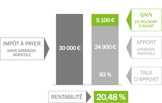 En pratique, en échange de votre subvention au développement économique de la filière agricole guyanaise, vous bénéficiez d’une réduction d’impôt supérieure à votre apport financier. Un exemple : vous voulez réduire votre imposition de 30 000 €. Il vous suffit alors d’apporter 24 900 € dans une opération Girardin Agricole (à affiner selon les situations) et vous gagnez la différence, soit 5 100 €, en pouvoir d’achat. Votre apport représente, en fonction de la période de souscription, entre 78 % et 83 % de la réduction d’impôt souhaitée.
